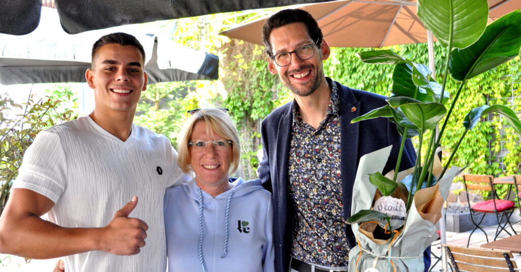 Stadtbürgermeister Liguori (rechts) überbrachte im Beisein der Inhaberin Simone Müller (Mitte) den Neuen Pächtern – vertreten durch den Enkel Armanno Jazvin (links) – die besten Wünsche der Stadt.